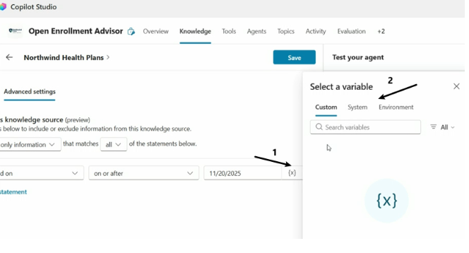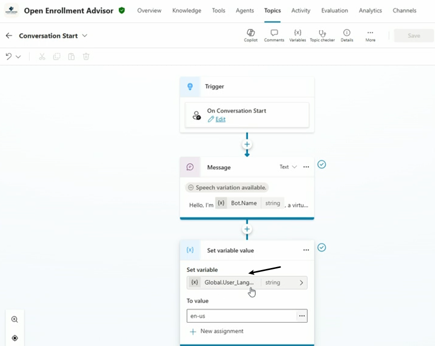 note, 上面的variable的可以在Copilot Studio的topic中进行定义,比如