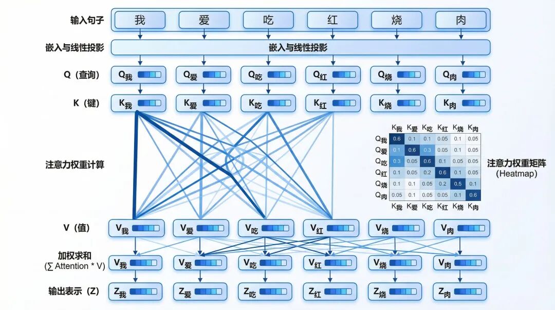 以句子"我爱吃红烧肉"为例:每个词都生成自己的Q、K、V,然后每个词的Q去查询所有词的K,计算相似度,用权重加权所有词的V,得到每个词的新表示,融合了整个句子的信息。