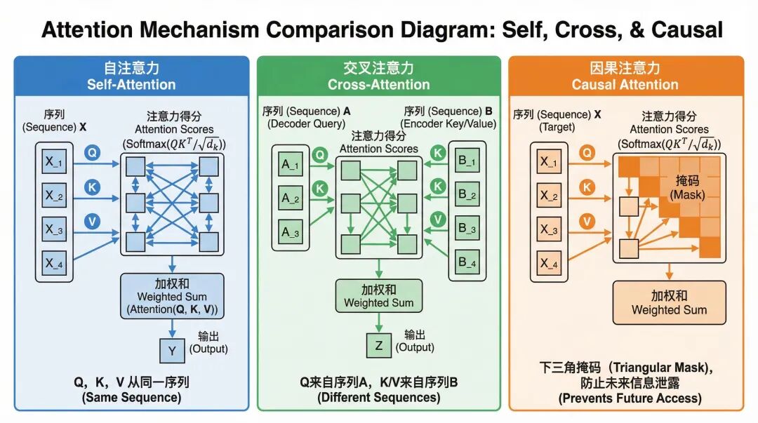 - **三种类型:**自注意力(序列内部)、交叉注意力(序列之间)、因果注意力(遮住未来)