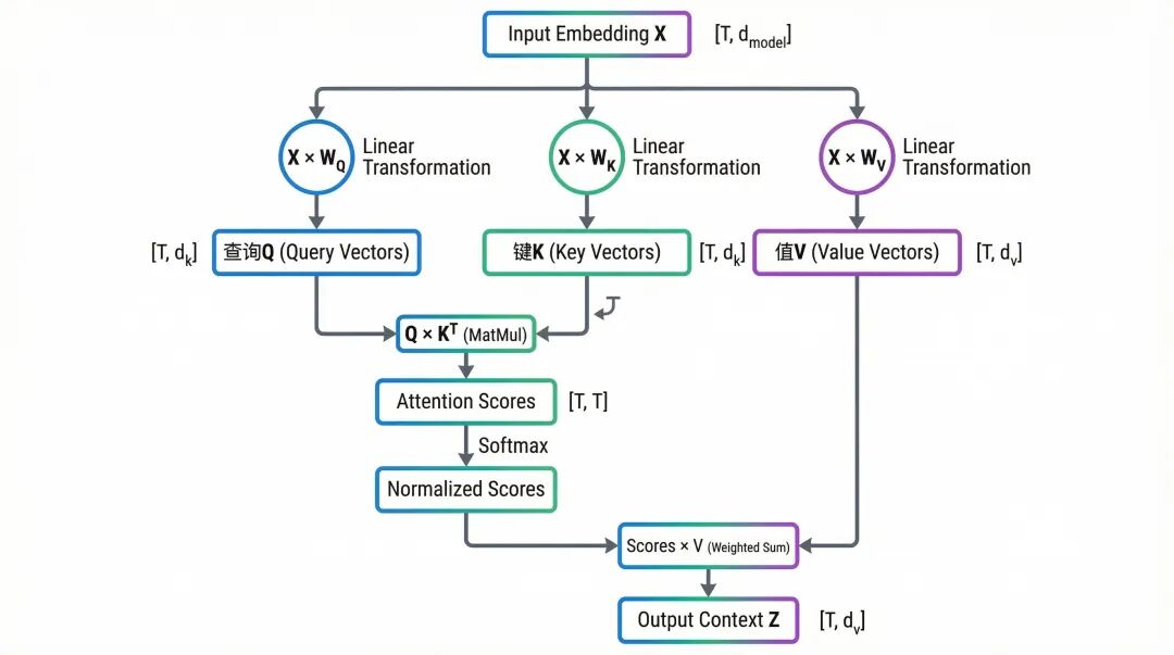 - **计算相似度:**Score = Q · K^T,用矩阵乘法计算Query和Key的相似度