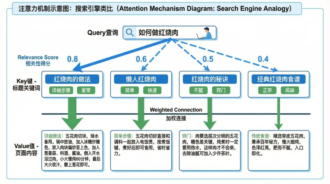 最好的类比就是使用搜索引擎:你在搜索框输入"如何做红烧肉"(Query),搜索引擎把你的问题和每个网页的标题关键词(Key)进行匹配,计算相关度得分,然后根据得分给网页分配权重,最后把相关网页的实际内容(Value)按权重加权求和,生成最终结果。