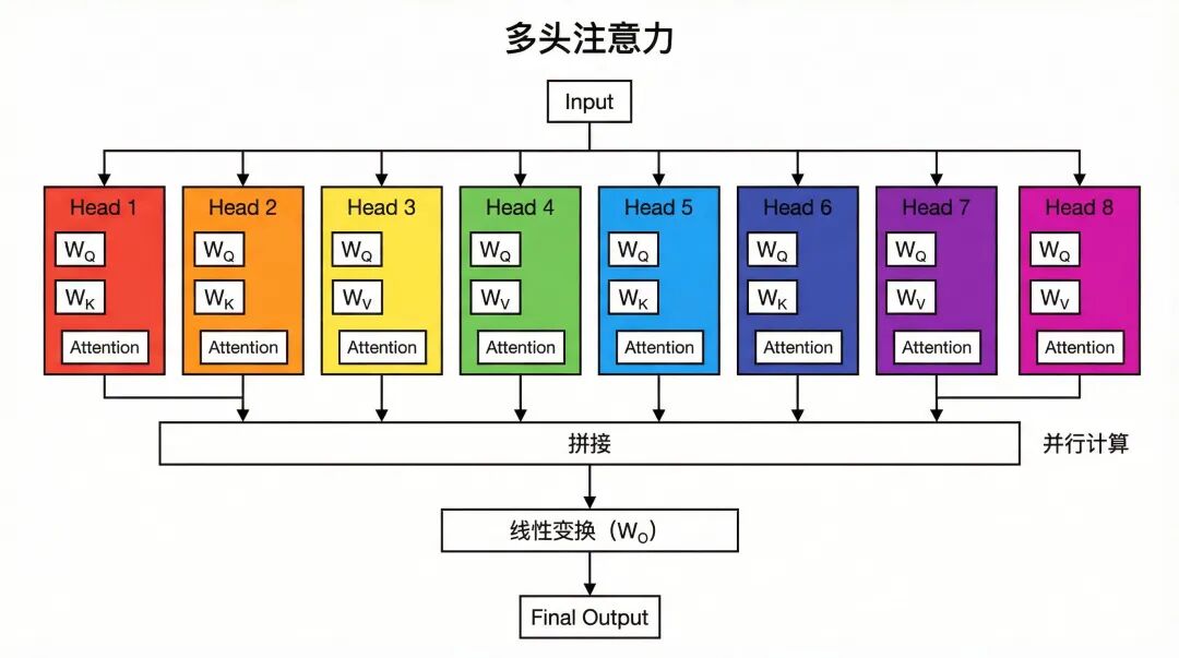 - **多头机制:**多个注意力头并行,从不同角度捕捉关系