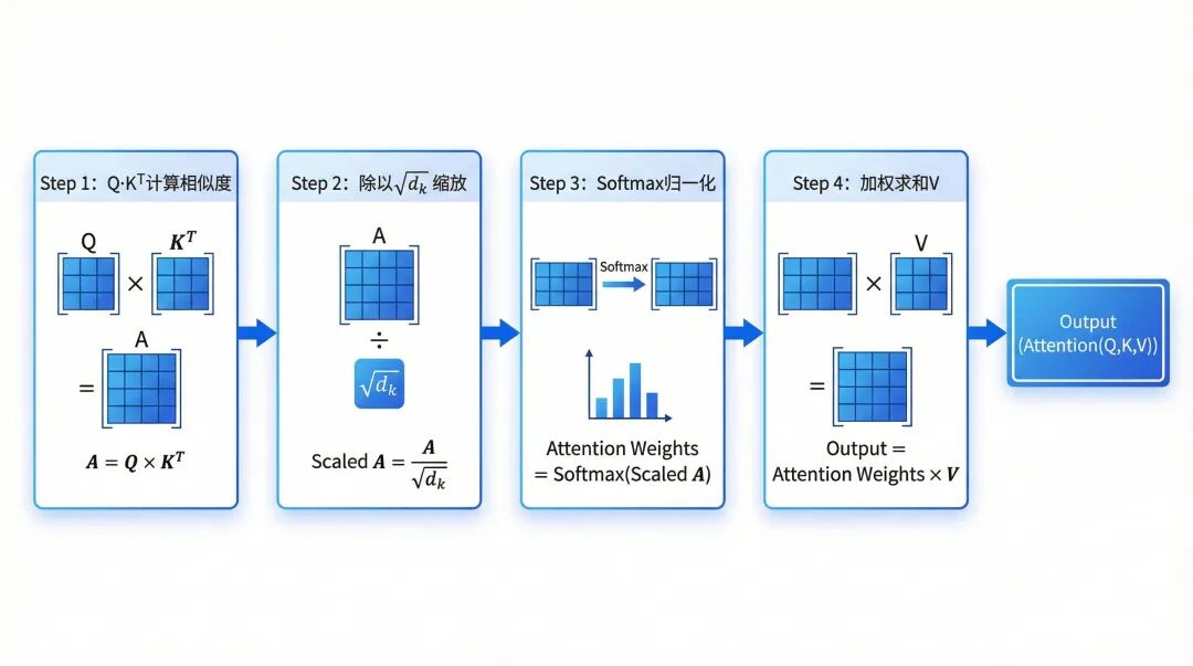 - **计算流程:**相似度计算 → 缩放 → Softmax归一化 → 加权求和