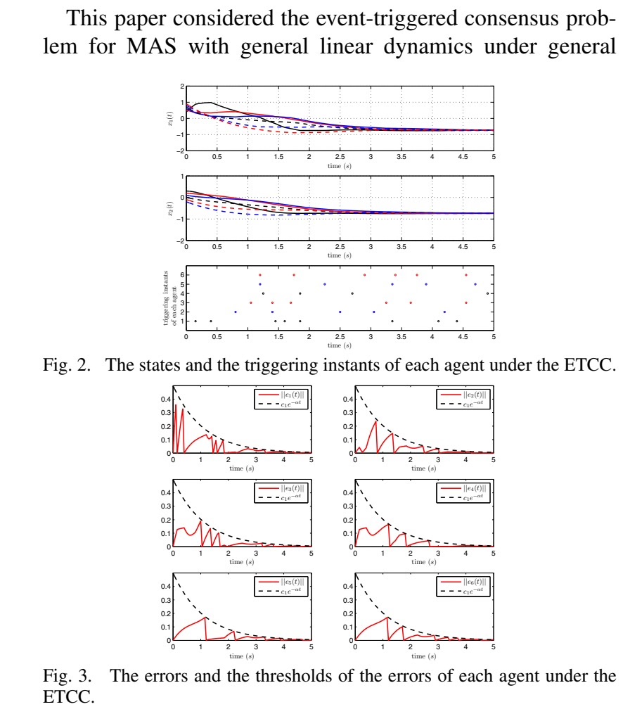 多智能体事件触发、一致性控制 状态轨迹图、控制输入图、事件触发图… 易于上手,有注释,有参考文献(与参考文献略有区别,适当变换能得到与参考文献相应的图形) 与文章不完全一致 图一:程序运行后的图形 图二:原文图形 图三:参考文献标题