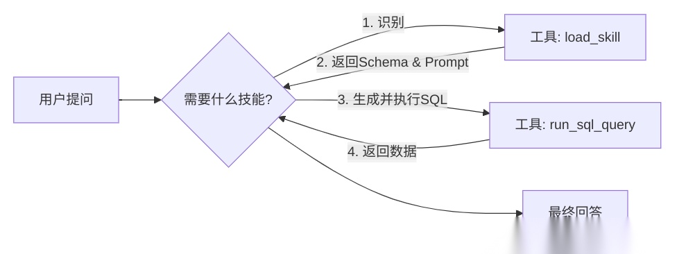 load_skill)加载该技能详细的上下文(Schema + Prompt)。 - 执行任务:基于加载的精确上下文,执行具体的任务(如编写并执行 SQL)。