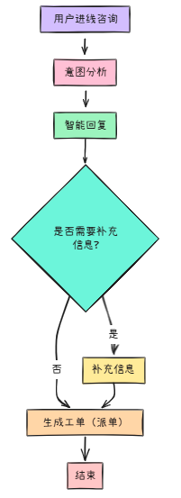 用户进线咨询 → 意图分析 → 智能回复(必要时补充信息)→ 生成工单(派单)→ 结束