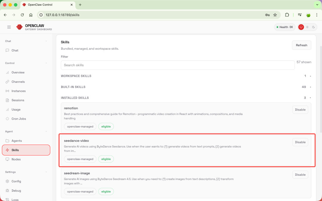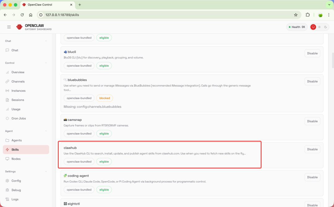 安装完成后在OpenClaw Web控制台: http://127.0.0.1:18789/skills 可以查看这个skill: