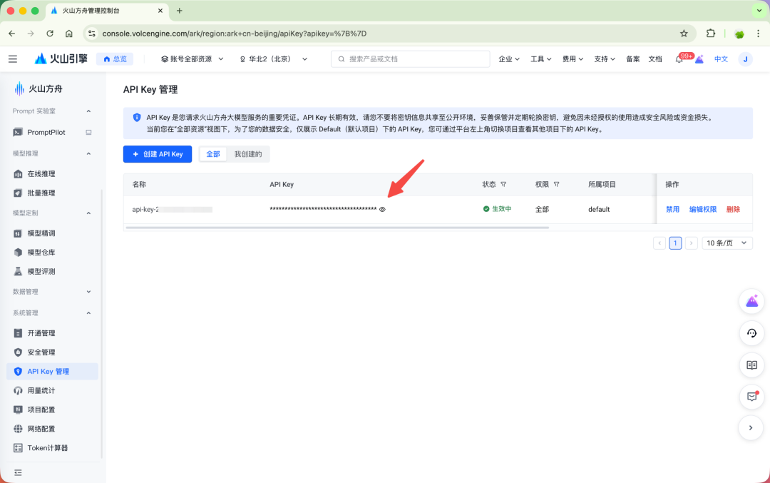 在火山方舟 系统管理 (https://console.volcengine.com/ark/region:ark+cn-beijing/apiKey?apikey=%7B%7D)中获取API Key