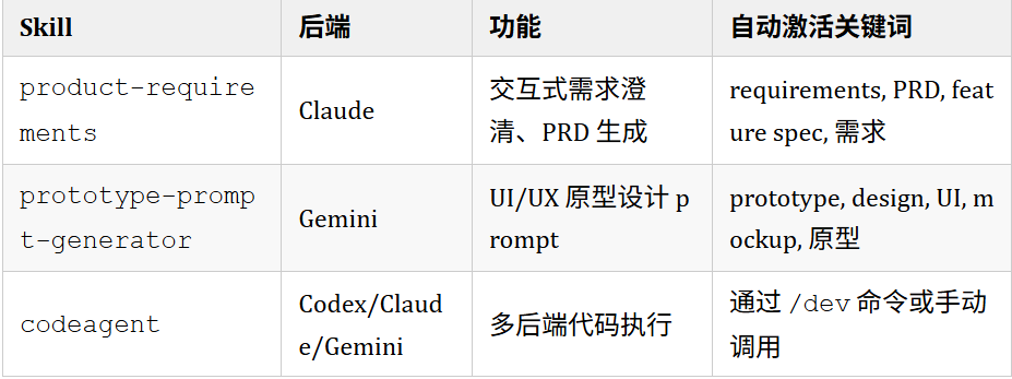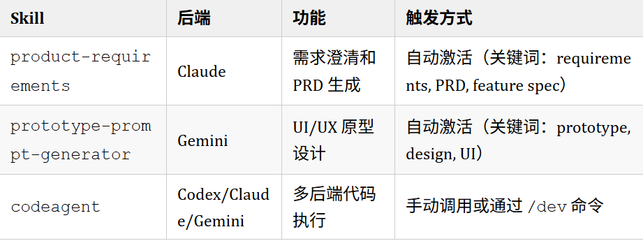 Skills 自动激活:说"我需要 PRD"自动触发 Claude,说"生成原型"自动触发 Gemini