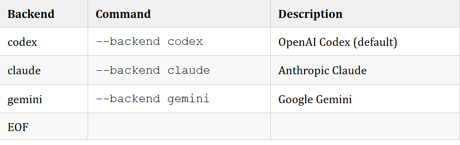 ounter(lineounter(lineounter(lineounter(lineounter(lineounter(lineounter(line codeagent-wrapper --parallel <<'EOF' ---TASK--- id: task1 backend: codex ---CONTENT--- task content EOFBackends