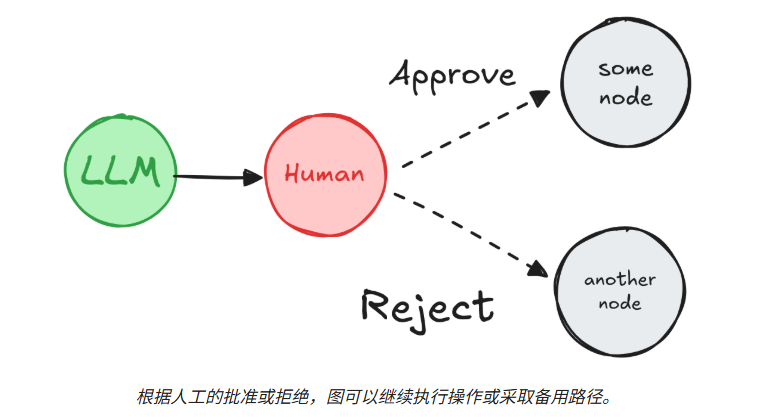 - 批准或拒绝:在关键步骤(例如API调用)之前暂停图,以审查并批准操作。如果操作被拒绝,您可以阻止图执行该步骤,并可能采取替代操作。这种模式通常涉及根据人工输入路由图。