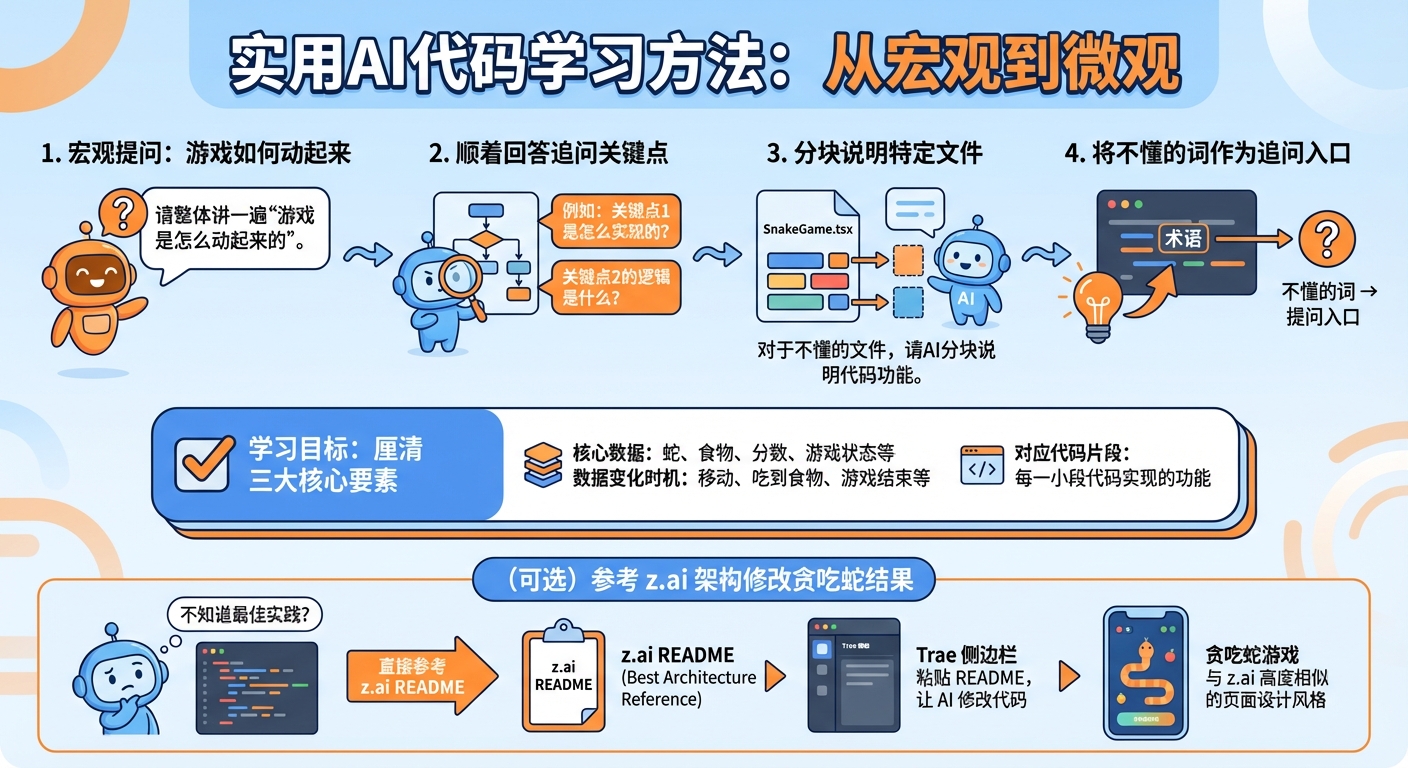 如果你看到某个文件(比如 SnakeGame.tsx)但完全不知道它在干什么,也可以直接请 AI 分块说明: