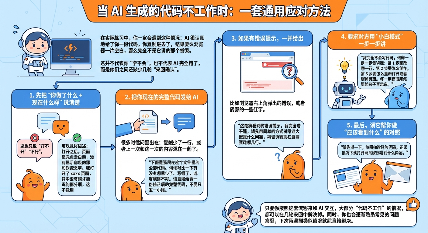 当代码“不工作”时,可以按下面这套固定流程来跟 AI 说: