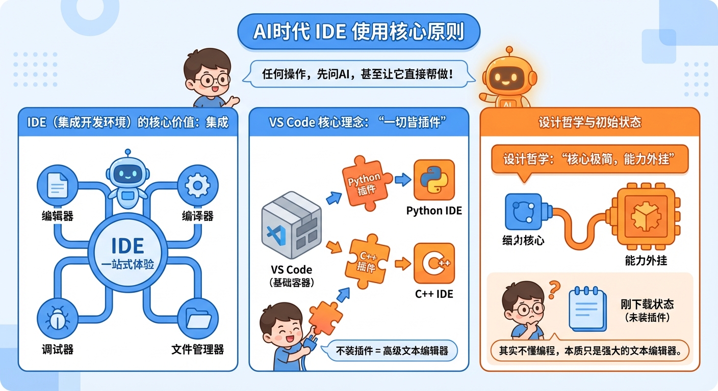 VS Code 的核心理念是“一切皆插件”。它通过插件机制支持各种语言,安装 Python 插件就是 Python IDE,安装 C++ 插件就是 C++ IDE。不装插件时,它只是个高级文本编辑器。