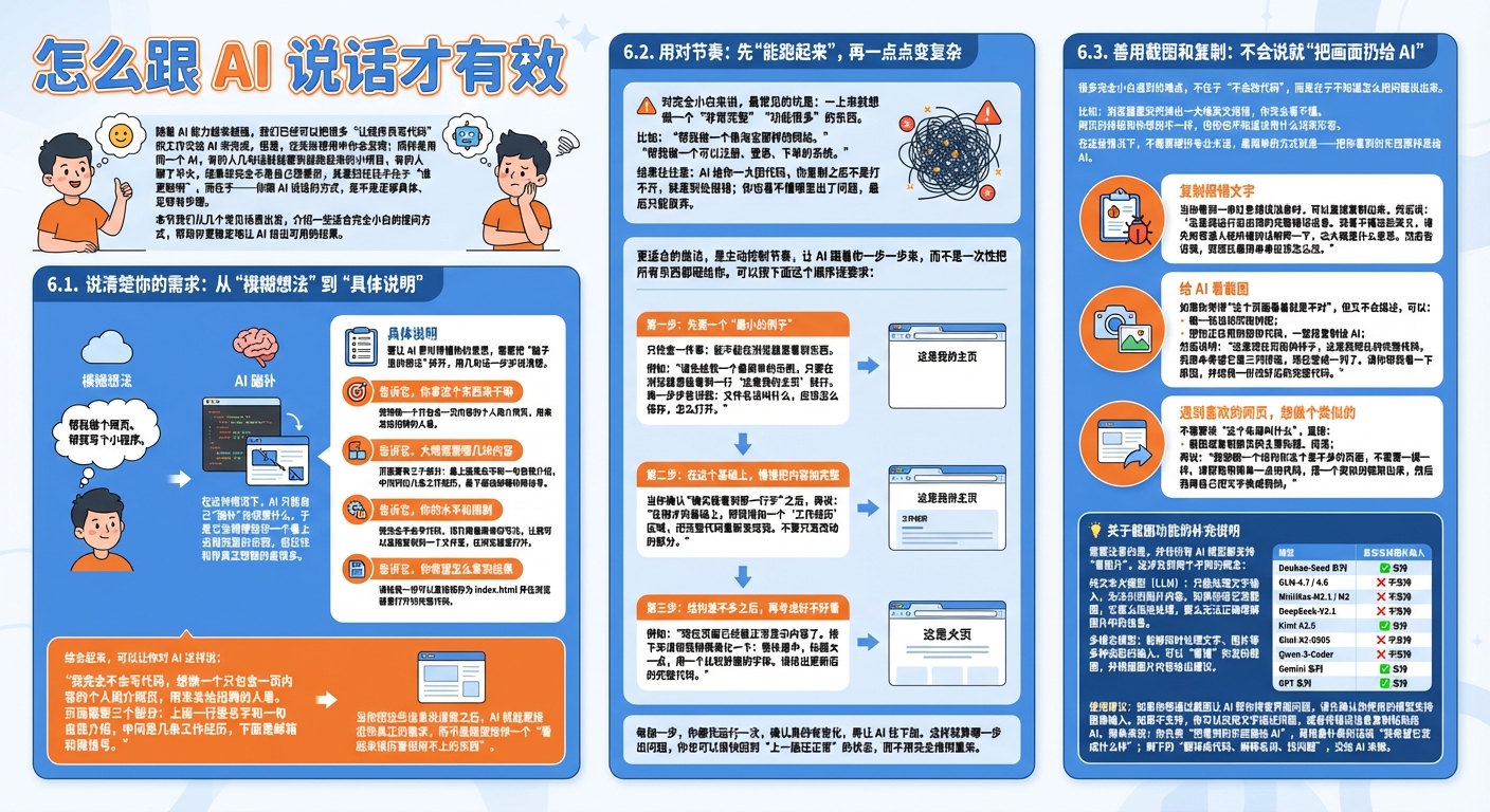 例如:请先说一下,按照你改好的代码,正常情况下我打开网页应该看到什么内容。只要你按照这套流程来和 AI 交互,大部分“代码不工作”的情况,都可以在几轮来回中解决掉。同时,你也会逐渐熟悉常见的问题类型,下次再遇到类似情况就能直接解决。