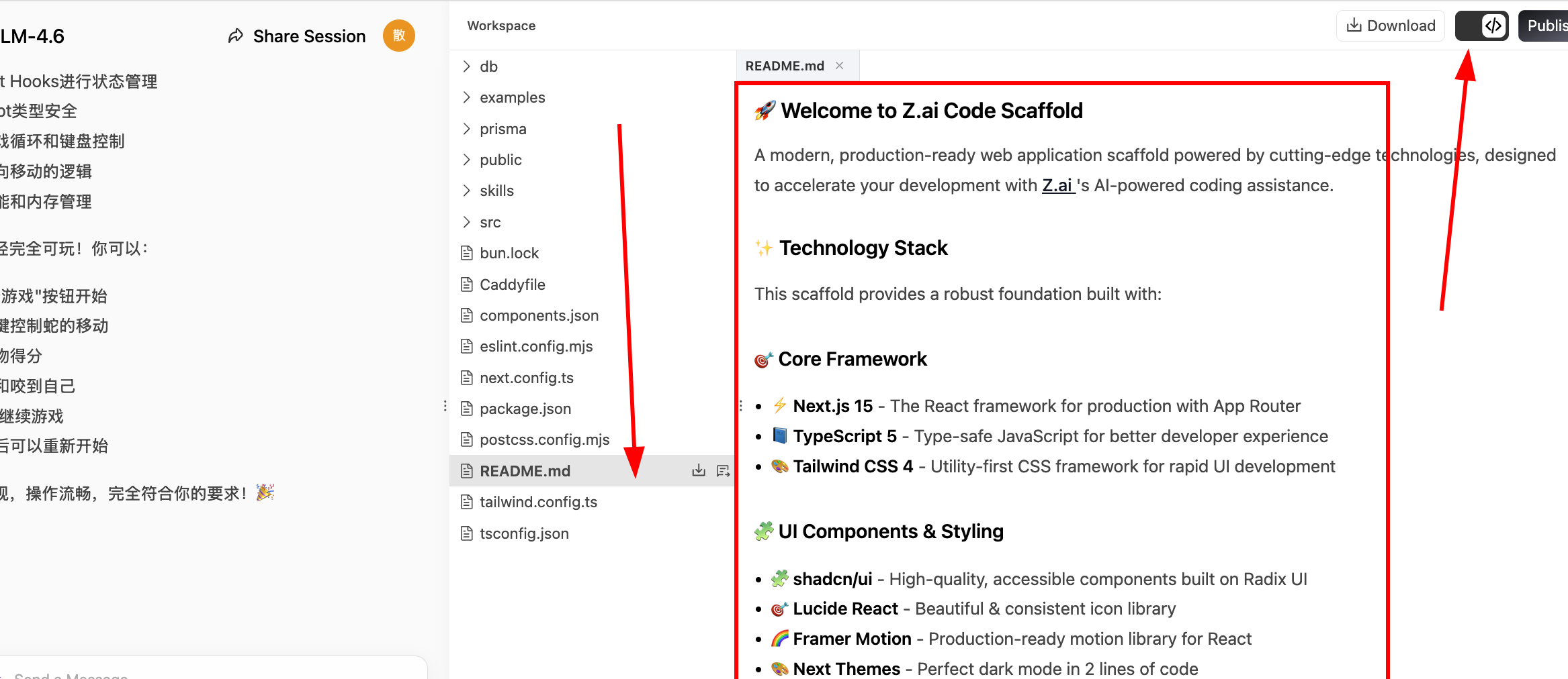 - 在 z.ai 等平台点击下载按钮,将项目保存到本地