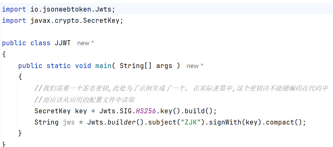 如果您希望生成一个足够安全的 SecretKey(对称密钥),用于 JWT 的 HMAC-SHA 系列算法(如 HS256/HS384/HS512),请使用对应算法的 key() 构建方法: