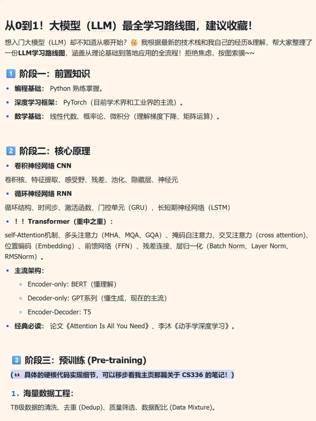 想入门大模型(LLM)却不知道从哪开始? 我根据最新的技术栈和我自己的经历&理解,帮大家整理了一份LLM学习路线图,涵盖从理论基础到落地应用的全流程!拒绝焦虑,按图索骥~~