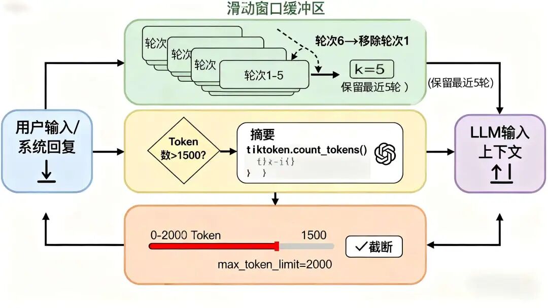 - 滑动窗口缓冲区:最简单方式,在内存维护固定大小队列,保留最近 K 轮对话。新对话产生时,最早对话移出窗口。例如,若设定保留最近 5 轮对话,当第 6 轮对话产生,第 1 轮对话就会被移除。