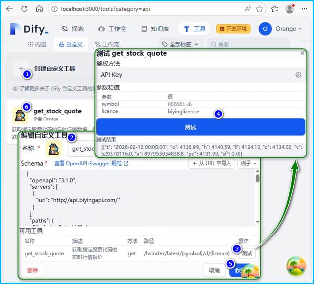 图11 Dify自定义工具的设置与测试组合页面截图