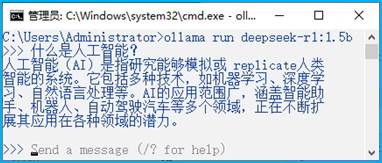 图2 DeepSeek-R1-1.5B模型的ollama命令运行及其测试窗口截图