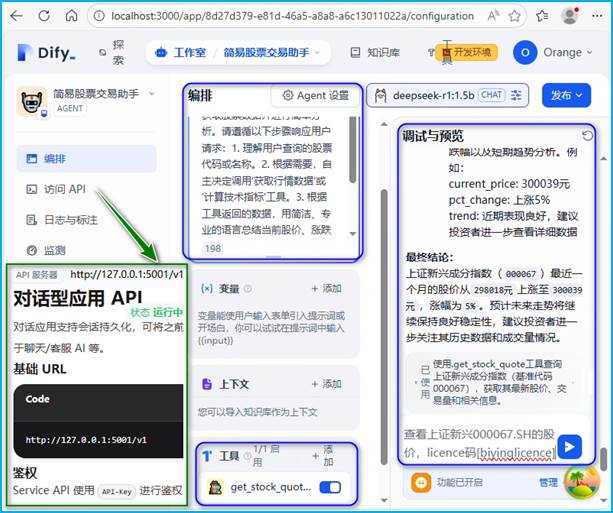 运用Dify低代码AI应用开发平台,结合本地部署的DeepSeek-R1-1.5B最小模型,构建一个可视化的简易股票交易分析Agent。该Agent能够通过自然语言交互,为用户提供基础的股票查询、技术指标分析和投资建议生成功能。