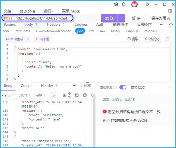 图3 DeepSeek-R1-1.5B模型的ApiFox工具访问测试窗口截图