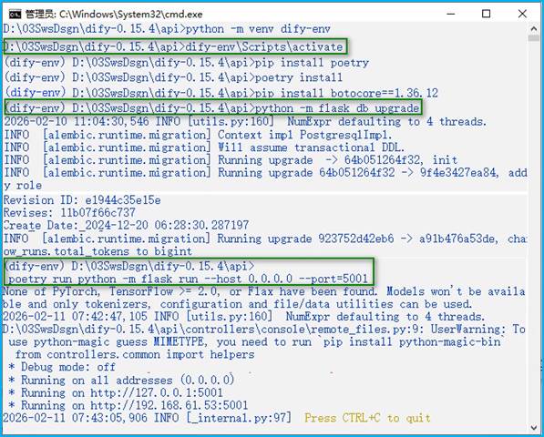 图6 Dify初始化数据库与启动后端服务命令操控组合截图