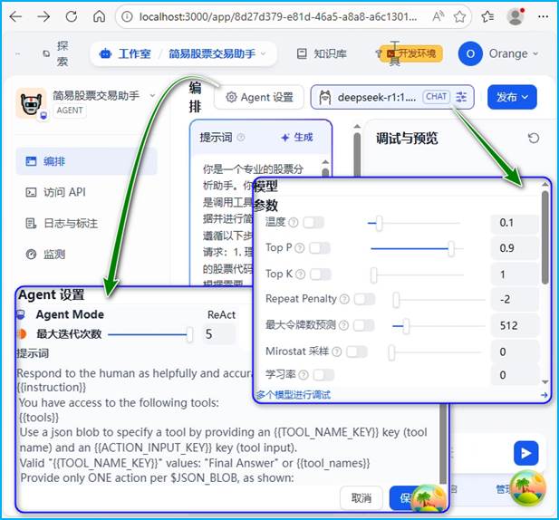 图14 Dify平台Agent设置与模型参数调整窗口页面组合截图