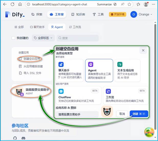 在Dify中创建并配置Agent应用,如图10所示:在Dify控制台点击「创建应用」,选择「Agent」模式,并输入应用名称,如“简易股票分析助手”。