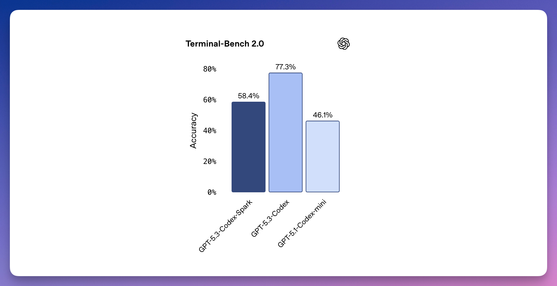 Codex-Spark 能在几分钟内搞定,准确率则介于 GPT-5.3-Codex 和 GPT-5.1-Codex-mini 之间。