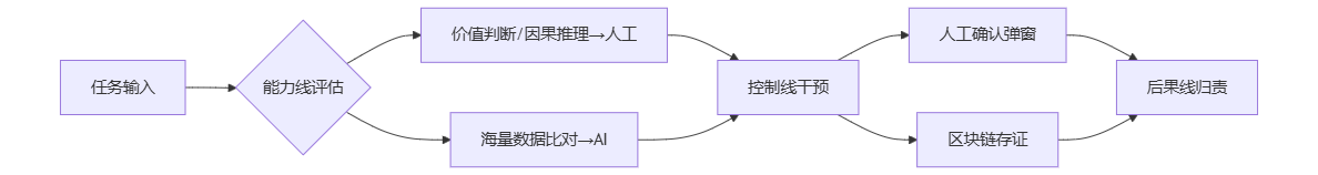人类专属域:价值判断(如伦理合规测试标准)、因果推断(缺陷根因分析)、例外处置(突发流量压测方案调整)需强制人工确认