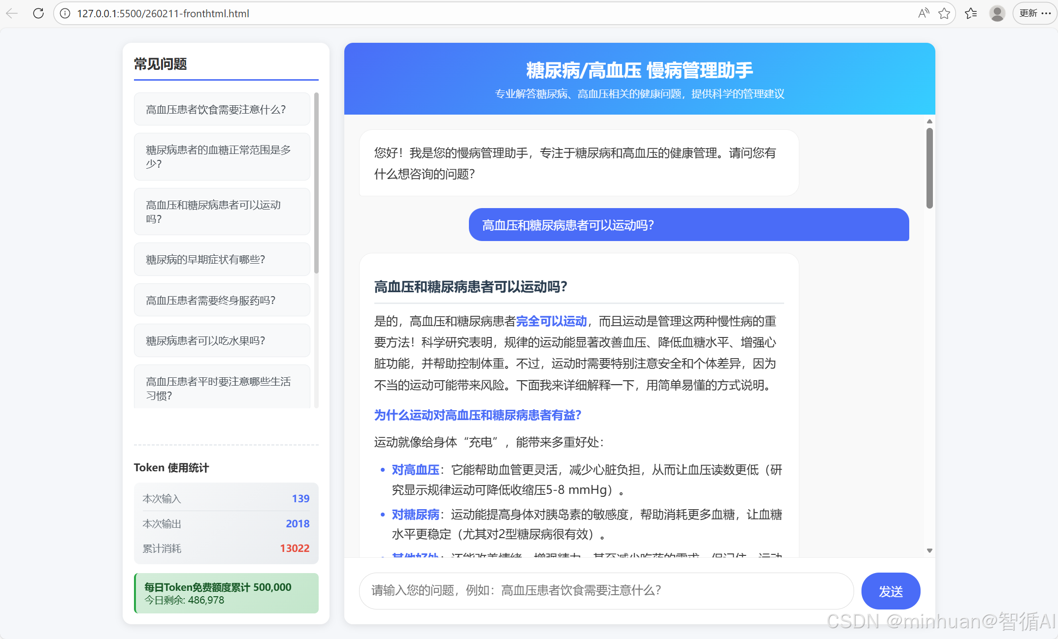 摘要:本文介绍了一个基于安诊儿AntAngelMed医疗大模型的慢病管理AI助手系统,旨在解决我国4亿慢病患者居家管理中的咨询痛点。该系统采用FastAPI后端框架和原生前端技术,实现了7×24小时专业健康咨询服务。AntAngelMed作为千亿参数的开源医疗大模型,在慢病管理场景与临床专家建议一致性达88.9%。系统支持Markdown格式的专业回答输出,包含饮食、运动、用药等建议,并实时统计T