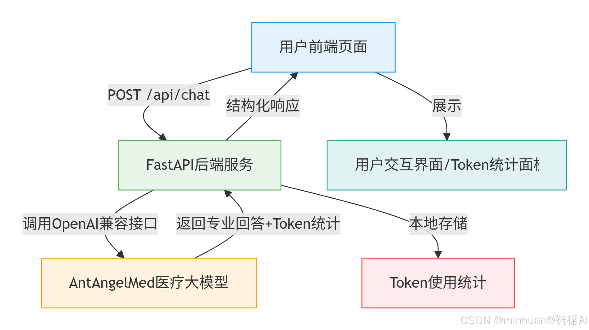 用户通过前端页面输入问题 → FastAPI 后端接收请求并校验 → 调用 AntAngelMed 模型获取专业回答 → 后端返回结构化数据(含 Token 使用量) → 前端渲染回答并更新 Token 统计,全程异步处理,响应速度快。