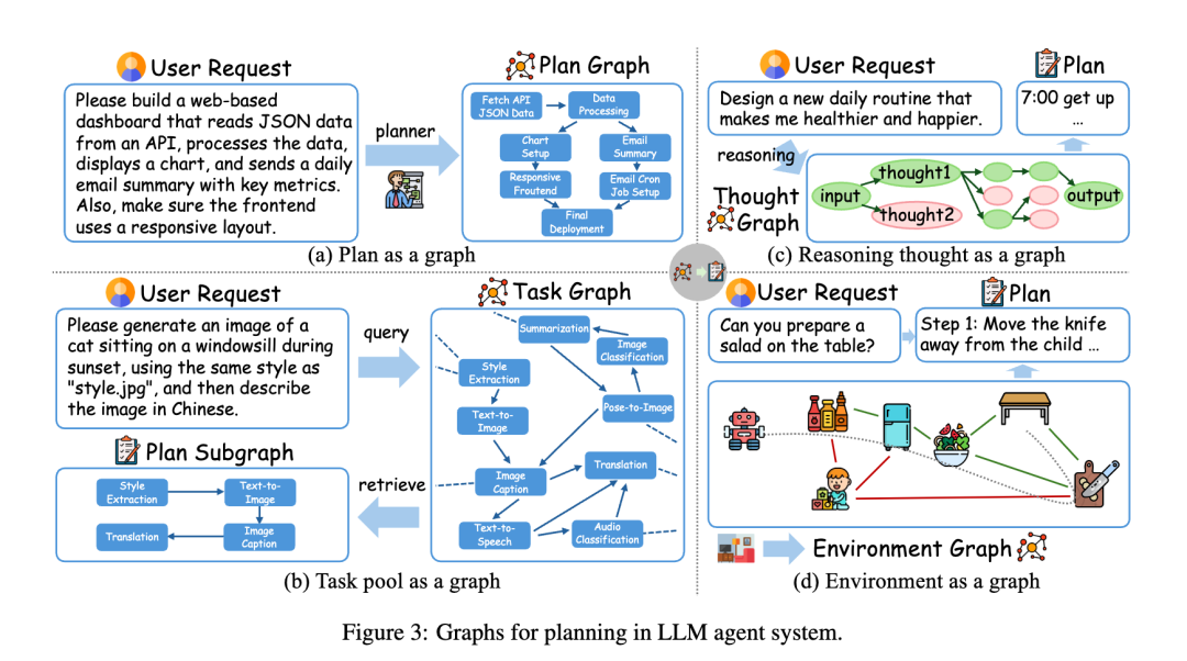 - ①计划图:将复杂任务分解为子任务,用节点表示子任务、边表示依赖关系,支持任务流协调(如AFlow),解决“任务分解混乱”的问题;
