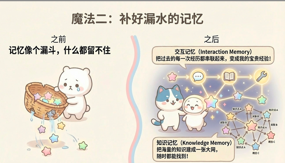 - 核心功能:存储事实、常识及各类领域知识,支持多跳推理(比如“由A推出B,再由B推出C”),提升Agent的知识储备。