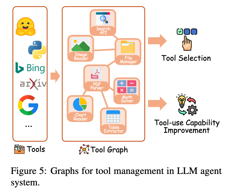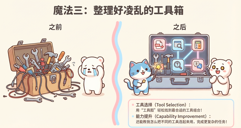 - 工具选择:通过工具图建模不同工具的功能依赖和兼容性,让Agent快速找到适配当前任务的工具,避免调用错误(代表方法:ControlLLM、ToolNet、SciToolAgent,适合多工具协同场景)。