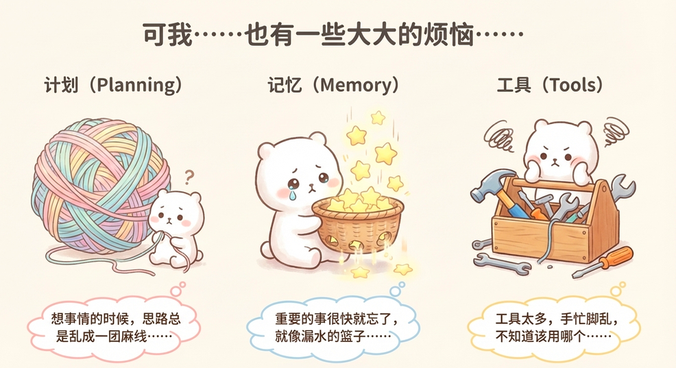 随着大型语言模型(LLM)技术的飞速迭代,基于LLM的智能体(Agent)已成为人工智能领域最具爆发力的研究方向之一,更是程序员、AI学习者进阶路上的核心重点。但很多小白和开发者在实践中会发现,纯LLM智能体在处理复杂任务时,常常会出现规划混乱、记忆低效、工具调用不准等问题——这些痛点不仅让智能体难以落地应用,也成为阻碍大家吃透智能体技术的关键难关。