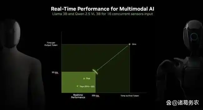 2025年8月新发布的Thor则带来了性能飞跃。其AI算力在FP4精度下高达2070 TFLOPS,搭载Blackwell架构GPU和14核Arm Neoverse-V3AE CPU,并配备128GB显存。这使得它能够原生支持并高效运行多模态大模型(如VLA, LLM, VLM),为人形机器人提供更强大的自主推理和交互能力。