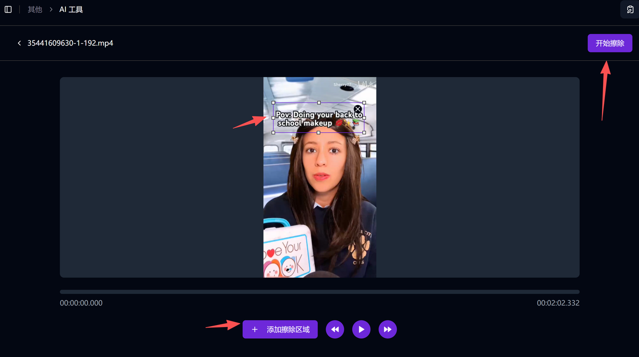 选择【AI 去水印 / 字幕】选项,上传需要处理的视频,并框选字幕所在的区域。系统会自动分析字幕特征,准备进行智能修复。