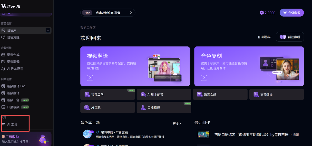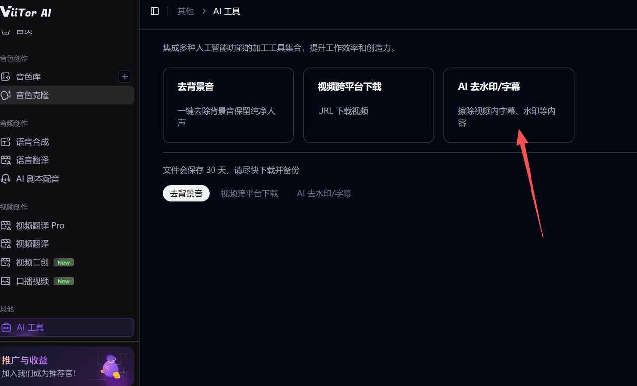 登录 ViiTor AI 官网,在首页找到并点击【AI 工具】。选择需要处理的视频文件进行上传,支持常见的 MP4 等格式。