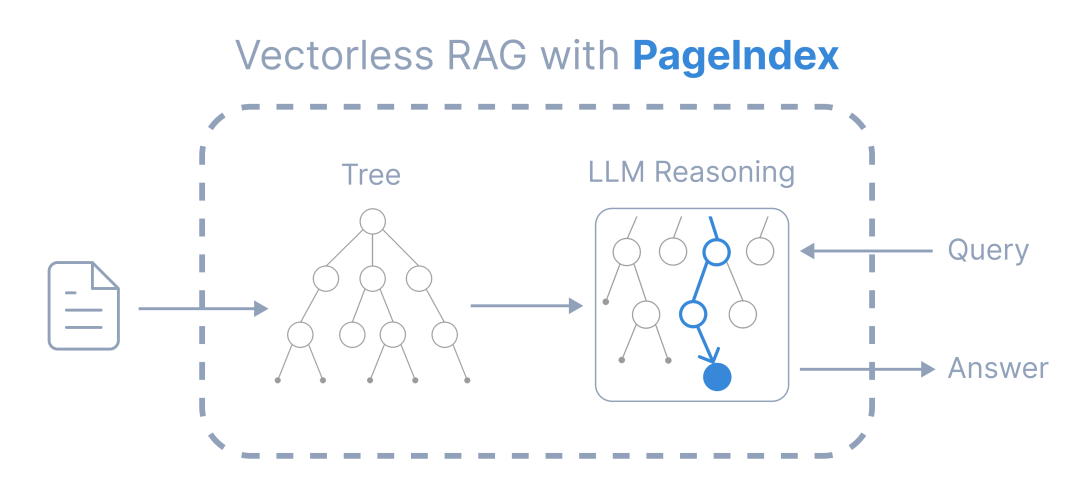 图 1:PageIndex 工作流——文档 → 树结构索引 → LLM 推理式树搜索 → 答案(来源:PageIndex 官方文档)