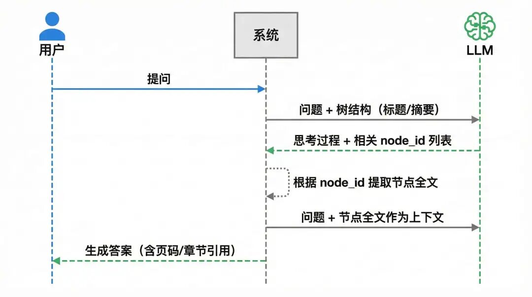 图:用户 → 系统 → LLM 的交互流程:提问 → 树结构推理 → 返回 node_id → 提取全文 → 生成答案