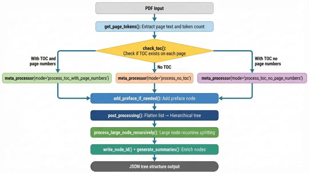 # 文件: pageindex/page_index.py L1021-L1056async def tree_parser(page_list, opt, doc=None, logger=None): # 第一步:检测文档是否包含目录 check_toc_result = check_toc(page_list, opt) # 第二步:根据 TOC 存在与否选择处理模式 if check_toc_result.get("toc_content") and \ check_toc_result["page_index_given_in_toc"] == "yes": toc = await meta_processor(page_list, mode='process_toc_with_page_numbers', ...) else: toc = await meta_processor(page_list, mode='process_no_toc', ...) # 第三步:后处理——添加前言、校验标题、构建树、递归细分大节点 toc = add_preface_if_needed(toc) toc_tree = post_processing(valid_toc_items, len(page_list)) await asyncio.gather(*[ process_large_node_recursively(node, page_list, opt, ...) for node in toc_tree ]) return toc_tree