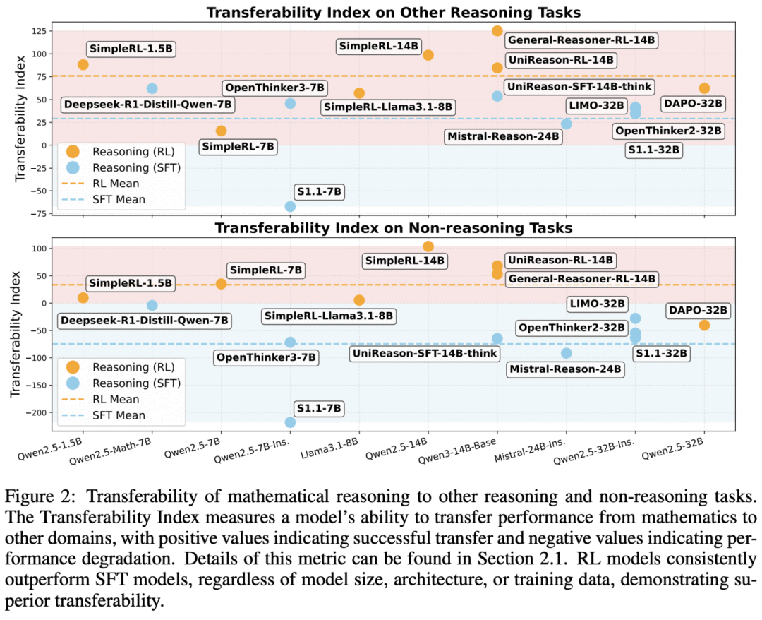如上图所示,监督微调训练的模型向非推理任务的迁移能力较差,而强化学习训练的模型在推理与非推理任务上均能泛化—— 强化学习模型的泛化能力超越数学领域,且天然避免灾难性遗忘。分析其他开源监督微调或推理模型在推理与非推理基准上的迁移能力时,也观察到相似趋势,如下所示。文献 [9] 的进一步分析表明,在线策略数据 —— 正如我们从文献 [2, 3] 中预期的那样 —— 与强化学习目标中负梯度的存在,是其优异泛化特性的关键因素。