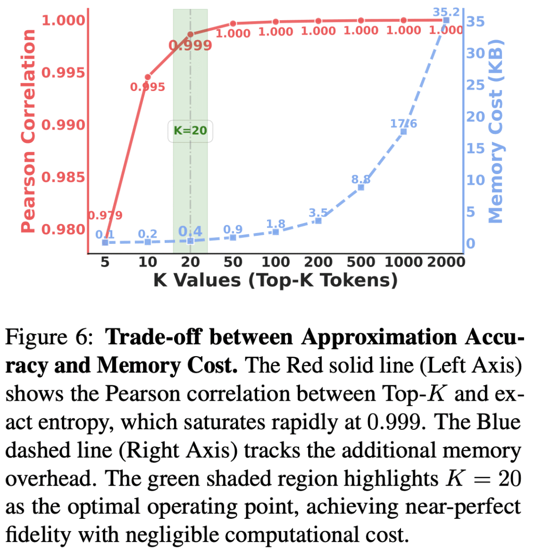 为提升熵自适应微调的效率,文献 [6] 的作者仅在分布的 Top-K(K=20)词元上计算熵。如下图所示,这一设置平衡了计算与内存开销的权衡,确保相比朴素监督微调,新增计算开销最小。
