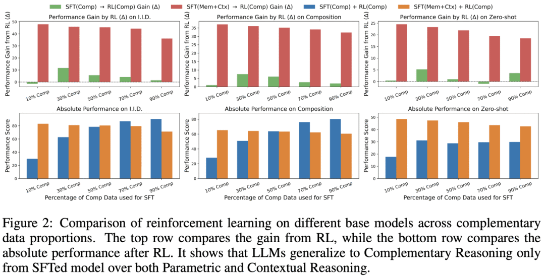 可见,该分析表明强化学习能将多种原子推理能力合成为更高层级(复合)的推理模式。不过这仅在模型先通过监督微调训练后才有可能实现。与之相对,纯监督微调训练能获得高域内表现,但分布外泛化能力差,这与先前工作的发现一致。换言之,监督微调倾向死记硬背推理模式,而非真正学习。当模型先通过监督微调习得基础原子推理能力后,强化学习就会充当“合成器”,让模型学会如何正确组合这些能力,解决复杂的复合推理问题。