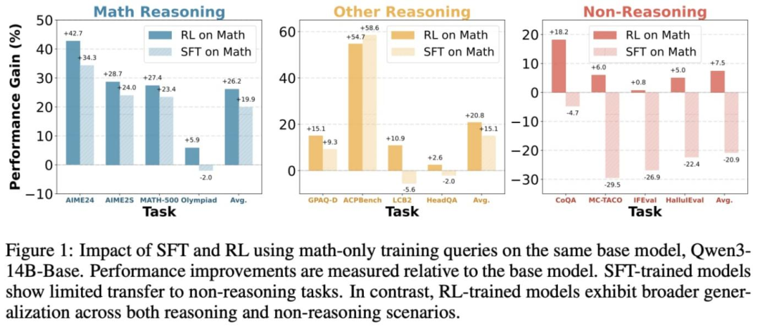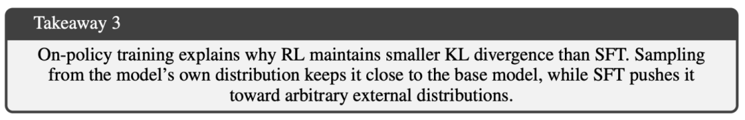 “强化学习表现良好,是因为其在线策略更新将解决方案偏向低 KL 区域;而当监督微调被显式引导至 KL 最小分布时,其表现可超越强化学习。”—— 引自 [3]