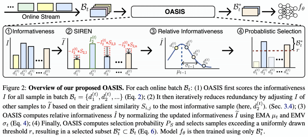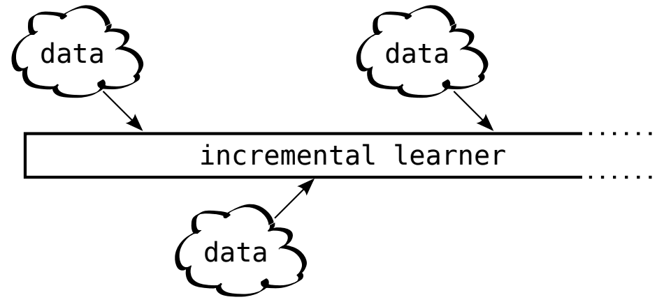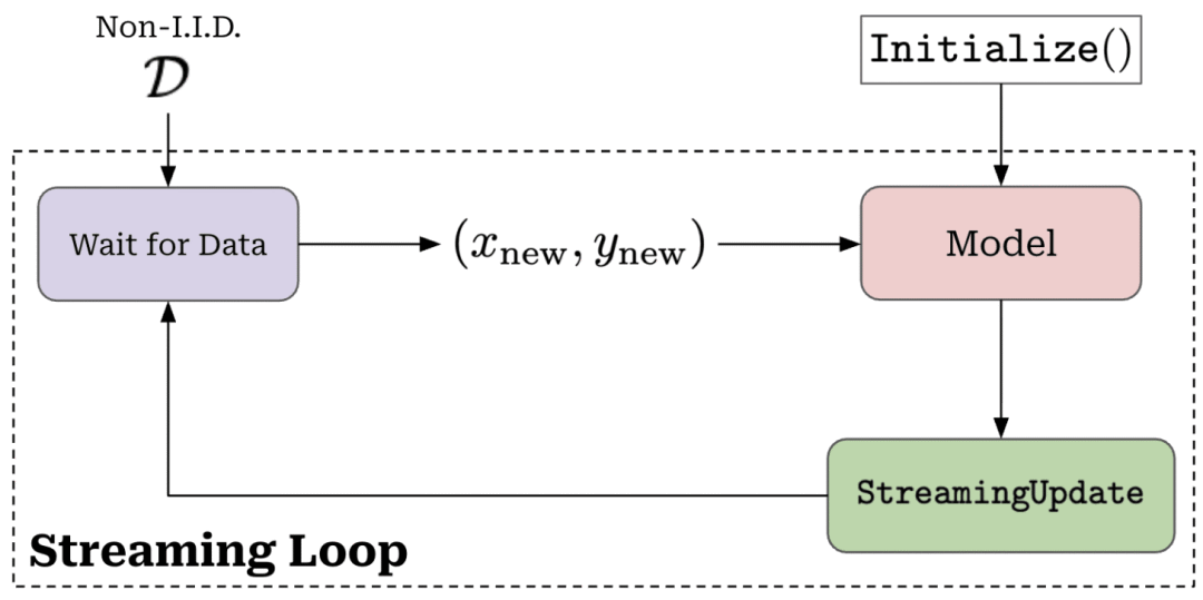 批次增量框架未必总是符合现实,因为模型接收的数据增量可能小得多。这类情况下,流式学习设置可能更合适。流式学习对每条输入数据进行简短的在线更新(即一次或少量前向与反向传播),迫使模型实时学习新数据,如下所示。