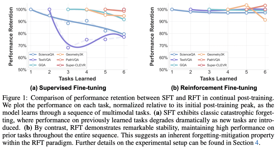“令人意外的是,在不使用任何数据回放的情况下,基于强化微调的持续后训练能达到与多任务训练相当的表现,即便为监督微调配备持续学习策略也无法实现这一效果。”—— 引自 [1]